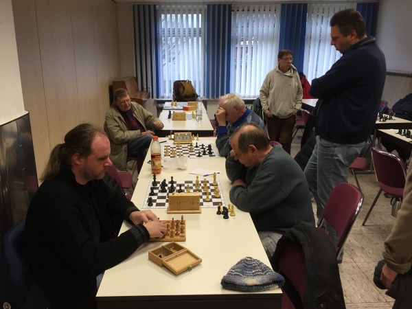 Bei den Partien von Wolfgang Hettler und Günter Würzberger war in Windeseile ein Großteil des Materials abgetauscht. Wolfgang erreichte ein Turmendspiel, das remis war, während Günter und sein Gegner sich weitgehend neutralisierten und somit auch dort eine Punkteteilung zur Folge hatte.