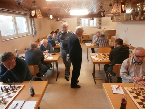 Auftakt des Mannschaftskampfes gegen Gründau. Vorne schon vertieft: Helmut Heiming (l.) und Hellmuth Lebermann.