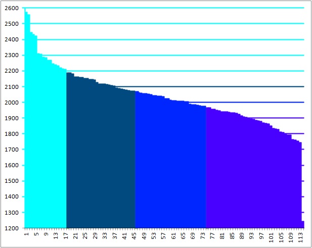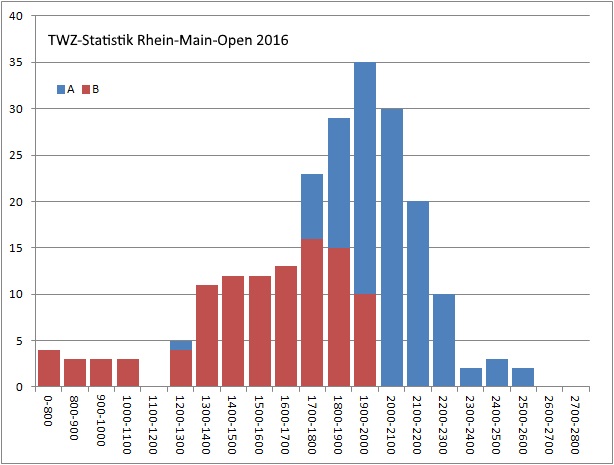 Die TWZ-Verteilung des A-Opens: An der Spitze wächst die Spielstärke relativ steil an, so dass die erste Ratinggruppe auch in diesem Jahr etwas nach oben gerückt wurde. Die letzte Gruppe ist relativ groß, weil die Preisgeldjäger dieser Spielstärke ja im B-Turnier antreten können.