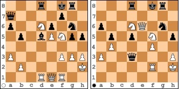 In der ersten Diagrammstellung beseitigte Helmut Heiming die starke Stützfigur mit 28. Txd5! exd5 und setzte vollständig auf Springerdominanz. Das Ende im rechten Diagramm spricht Bände!