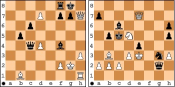 Bemerkenswert war die wild-romantische Spielweise der jüngsten Spieler am 4. Brett. In den Diagrammen die Endstellung aus der ersten Partie und das für die Beteiligten überraschende Mattbild aus der zweiten Partie.