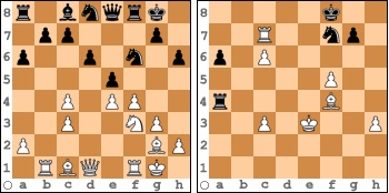 Das erste klare Bild dann am Brett von Edelreservist Egon Merkle. Nach druckvollem Spiel gewann er in der linken Diagrammstellung durch 15. fxe5 dxe5 16. La3 Tf7 17. Sxe5 Dxe5 18. Dxd8+ Kh7 19. Dd4 einen Bauern bei überwältigender Stellung.