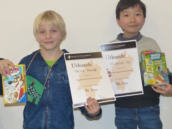Die beiden schlugen sich prima und Felix lief mit ausgezeichneten 4½ Punkten aus 7 Partien sogar auf dem 14. Platz ein. Dabei sollte man bedenken, dass er auch nächstes Jahr noch zur U8 gehören wird. Michael wurde 36. von insgesamt 58 Teilnehmern.
