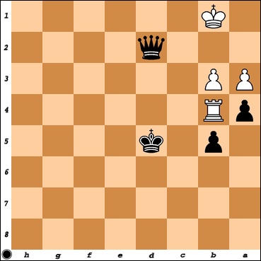 Schwarz sah sich schon auf der Gewinnerstraße. Es folgten: 56. ... Dxb4 57. axb4 axb3 58. Kb2 Kc4 59. Ka3 b2. Anstelle des nun erwarteten 60. Kxb2 zog Weiss allerdings 60. Ka2!! und nach 60. ... b1L+ 61. Kxb1 Kxb4 62. Kb2 endete die Partie remis.