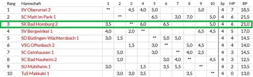 Im Ergebnis fuhren wir einen ungefährdeten 6,5 : 1,5 Sieg ein, wobei die hinteren 4 Bretter - also die erwähnten Ersatzleute - jeweils gewannen. Mit diesem Sieg stehen wir mit einem Mannschaftspunkt hinter Spitzenreiter Oberursel auf dem dritten Tabellenplatz.